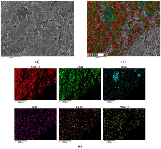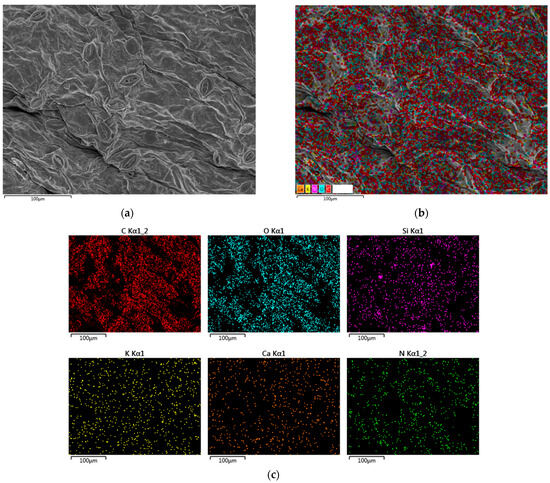 As illustrated in Figure 12, the primary elements contained in the Green Sichuan Pepper pericarp include carbon (C), oxygen (O), silicon (Si), potassium (K), calcium (Ca) and nitrogen (N). C and O constitute the most significant portion of the cellular walls, cytoplasm and proteins, indicating that the main components of the Green Sichuan Pepper pericarp are cellulose and other carbohydrates. The elements Si and Ca play critical roles in reinforcing the strength and structural stability of the cell walls. By comparing the comprehensive EDS images shown in Figure 12b and Figure 13b, it can be obviously seen that the distribution of elements (C, O, Si, K, Ca and N) on the pericarp surface at a drying time of 60 min is more uniform than that of a drying time of 360 min, and the elements C, O, Si, K, Ca and N at a drying time of 360 min reduce more than 10% compared with that of a drying time of 60 min, which might be due to the reduction of internal moisture during the drying process leading to cellular structure contraction, further affecting the distribution and the observation of the elements.