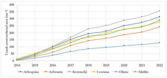 Variation in trunk cross-sectional area in the six cultivars during the years under evaluation.