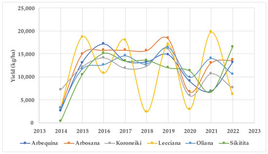 Furthermore, yield also showed high stability (low alternate bearing) across years for all cultivars except ‘Lecciana’. This is despite the high variability in rainfall and temperature observed over the 9 years of this study. The lower yields in 2020 and 2022 with respect to previous years could be explained by the high summer temperatures reported in those years, but also by the fact that the hedgerow was growing older. ‘Koroneiki’ was previously reported to have a high tendency for biennial bearing in Cordoba, southern Spain [25], and in the previously mentioned Toledo trial, ‘Arbosana’ and ‘Sikitita’ showed less alternate bearing than ‘Arbequina’ and ’Koroneiki’. These differences in alternate bearing between experiments might be due to climatic differences that promote differences in growth rate among the cultivars. Other traditional cultivars tend to have higher alternate bearing than those used here, probably due to their higher vigor and pruning needs [18].