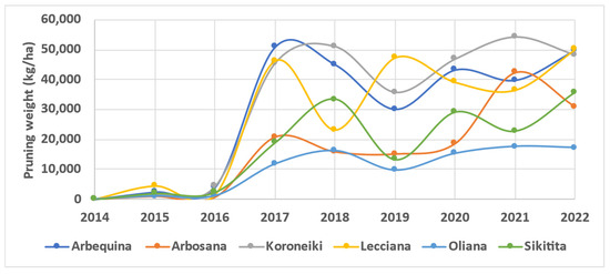 One of the main constraints on olive cultivars to be suitable for hedgerow growing systems is training them in a way that can be harvested by straddle machines, while still allowing for a high and stable olive yield with the pruning needed for this training [3]. The six cultivars evaluated in the present comparative trial were initially considered suitable for this growing system [1]. In fact, ‘Arbequina’, ‘Arbosana’, and ‘Sikitita’ were reported to have lower vigor than other traditional cultivars when trained in hedgerows [6,17,18]. However, a high pruning volume was observed for all cultivars, especially in the adult period. This reinforces the idea that pruning is a critical operation for the long-term viability of this growing system [1] and that cultivars with low pruning needs but with high and stable productivity are needed.