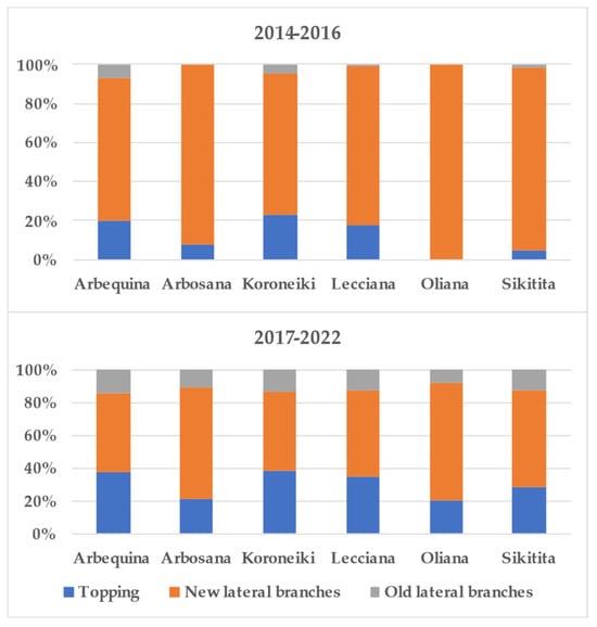 ‘Koroneiki’, ‘Arbequina’, and ‘Lecciana’ showed the highest pruning weight almost every year (Figure 3). In those three cultivars, top pruning also represented a higher proportion of total pruning than in the other three cultivars in both young and adult trees (Figure 4). In the meantime, ‘Arbequina’ and ‘Koroneiki’ showed the highest proportion of old lateral branches in young trees. In adult trees, ‘Oliana’ had a lower proportion of old lateral branches than the rest.