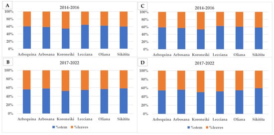 The proportion of total pruning weight on a dry basis, corresponding to stems and leaves, was very similar in all cultivars and in both young and adult trees (Figure 5A,B). Only ‘Koroneiki’ showed a slightly higher proportion of leaves than the rest of the cultivars. Those percentages also showed similar values (Figure 5C,D) in the three groups of pruning materials (top pruning and young and old lateral pruning).