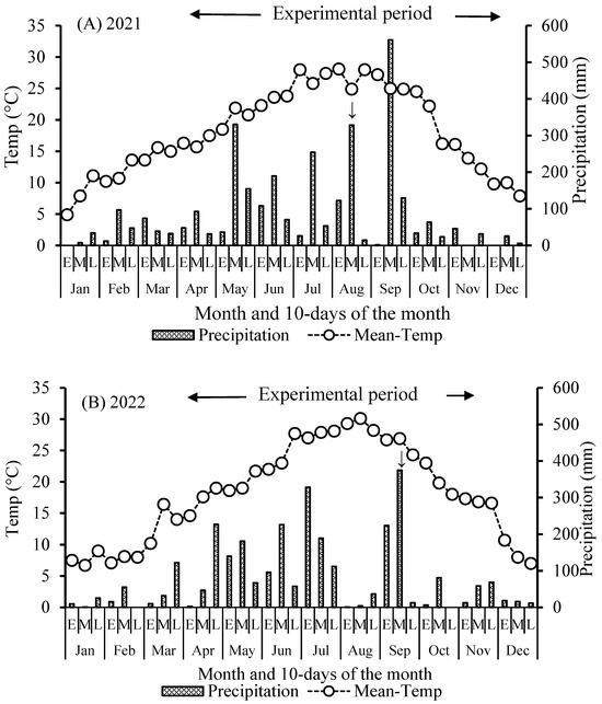 The meteorological data, such as temperature, rainfall, and typhoons, were obtained from the Japan Meteorological Agency [24]. In 2021, the experimental period was from mid-April to early December, when the mean temperature was 21.9 °C and the cumulative rainfall was 2611 mm. Typhoon No. 9 in 2021 approached in early and mid-August. The numbering of typhoons was announced by the World Meteorological Organization. The rainfall distribution was abundant in mid-May, mid-August, and mid-September, with limited rainfall from late August to early September. The high autumn temperature occurred from late September to mid-October, when the mean temperatures of 10 days were maintained above 22 °C (Figure 1A).