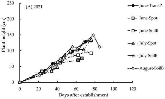 The height of the plants in the amaranth tended to be lower, at around 150 cm, in 2021 than in 2022 and 2023, at around 200 cm, without damage from a typhoon or heavy rain. In 2021, the establishment with direct seeding in the spot or pretreated soil seed balls in June reduced the height of the plant due to heavy rainfall in the establishment (Figure 4A). In the case of establishment in July, the height of the plant in soil seed balls increased at the same rate as in transplants in June and in soil seed balls in August, followed by direct seeding in the spot (Figure 4A).