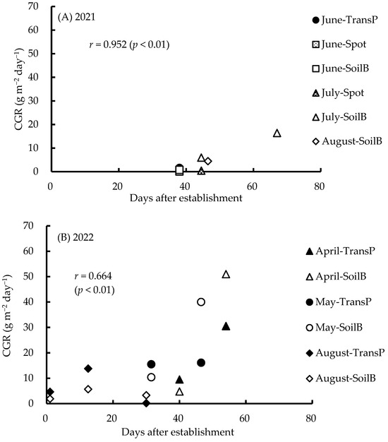The changes in CGRs on days after establishment are shown in Figure 5, where the significant positive correlation (p < 0.01) is obtained every year. These correlations suggest that the CGR in amaranth increased dramatically around 40 days after establishment to reach above 50 g m−2 day−1 in 2022 and 2023 (Figure 5B,C, respectively). The highest CGR revealed was in the soil seed balls sown in April in 2022 and 2023.