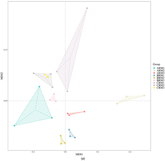 NMDS plots of soil fungi based on Bray–Curtis distance matrix under different residual mulch levels (a) for rhizosphere fungi and (b) for non-rhizosphere fungi.