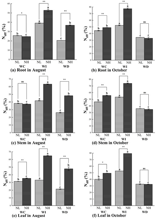 In the stems of Mongolian pine seedlings, the Ndff (%) in August was higher in all nitrogen treatments compared to the control treatment (WC). In October, the Ndff (%) in the stems showed a trend of increase or decrease corresponding to the changes in moisture levels, with significant differences observed under different nitrogen treatments (Figure 4c,d). Under the WC moisture treatment, there were no significant differences in Ndff (%) between the NL and NH nitrogen treatments. In October, the effect of the changes in moisture levels on Ndff (%) in the stems was less pronounced under the NL treatment compared to the NH treatment. Under the WD treatment, different nitrogen levels did not result in significant differences in Ndff (%) in the stems of the seedlings.