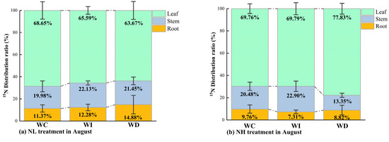 As shown in Figure 5, the distribution ratios of 15N in different organs of Mongolian pine seedlings under various nitrogen and moisture treatments in August and October were consistently in the order of leaves > stems > roots. In August, under the NL treatment (Figure 5a), changes in moisture availability (whether an increase or a decrease) affected 15N distribution. With increased moisture availability, 15N tended to transfer downward from the leaves to the stems and roots, with a higher retention in the stems compared to the control group and the WD treatment. Conversely, with decreased moisture availability, 15N in the leaves tended to transfer more towards the roots compared to the control group and the WI treatment. Under the NH treatment in August, compared to the control group (WC), the WD treatment resulted in more 15N being allocated to the leaves and less to the stems compared to both the control group (WC) and the WI treatment. When moisture was reduced, more 15N was allocated to the roots of the seedlings compared to increased moisture conditions, although it was still less than in the control group. Overall, under high nitrogen concentration, increased moisture led to relatively more 15N being allocated to the stems and leaves of the seedlings, while reduced moisture resulted in slightly more 15N being allocated to the roots.