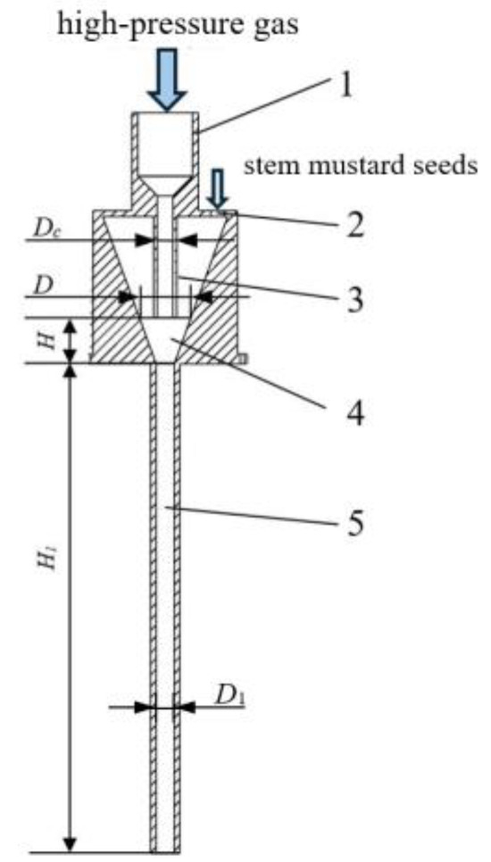 As the core component of the dual-row pneumatic injection seeding device (as shown in Figure 2), the high-pressure gas enters into the inner part of the shot seeder through the air inlet, then enters into the mixing area through the air outlet pipe, and finally realises the rapid shot seeding of seeds into the soil under the action of the high-speed airflow. In operation, the external compressed high-pressure gas is used as the working fluid to realise precise seed sowing, the device introduces air through the air inlet and creates a high-speed airflow from the air outlet pipe. The airflow at the outlet creates a negative pressure in the internal chamber, which is steadily accelerated in the mixing zone to form a positive-pressure accelerated airflow. In this process, the seeds are attracted to the inlet and quickly inhaled, along with the highspeed airflow into the acceleration pipe. Inside the acceleration pipe, the seeds are fully mixed with the positive-pressure accelerated airflow and accelerated, and finally ejected from the lower end of the acceleration pipe at a high speed to hit the soil. In the acceleration pipe, the seeds are mixed with the positive pressure acceleration airflow and accelerated. In the accelerating pipe, the seeds will experience friction and collide with the pipe wall and lose energy, so it is necessary to reduce this energy loss. To achieve this, the diameter of the accelerating pipe D1 is increased, but increasing the diameter leads to expansion of the gas volume [19], which reduces the flow rate of the high-velocity accelerating gas stream [20], which is unfavourable to the acceleration of the stem mustard seeds. Therefore, the diameter of the accelerating pipe should be as small as possible according to the single seed flow. In this study, an accelerating pipe with a diameter of 5 mm was chosen.
