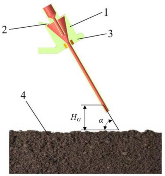 Structure of pneumatic seeding test device (HG is the vertical height, (mm); α is the angle of incidence, (°); 1. shot seeder; 2. seed inlet; 3. shot seeding stand; 4. Soil).