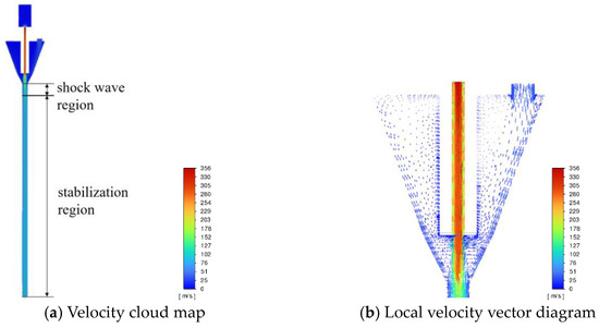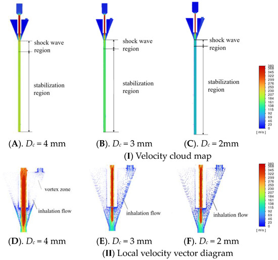 After synthesising the above analysis, it can be concluded that a mixing zone inlet diameter of D = 15 mm is a more ideal choice. With this size, there is no local eddy current in the lower part of the inlet, the area of the shock wave zone is minimised; the maximum value of the steady-state gas flow rate is 135 m/s, and the gas enters the mixing zone with a smoother inhalation flow line. Therefore, this size design can meet the requirements and improve the system’s performance.