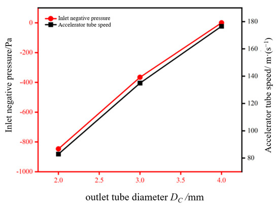 The Fluent numerical extraction function reveals that the diameter of the outlet pipe influences the test metrics. The relevant data are demonstrated in Figure 8. From Figure 9, it can be seen that when the diameter of the outlet pipe increases, the steady-state gas flow rate rises rapidly, fluctuating between 83 and 177 m/s. At the same time, the inlet negative pressure also increases gradually with the increase in the outlet pipe diameter. When the diameter of the outlet pipe DC is 2mm, the inlet negative pressure is the largest, reaching 846.275 Pa; while when the diameter of the outlet pipe DC is 4 mm, a vortex will be formed, resulting in a sharp drop in the inlet negative pressure to a minimum value of 0.031 Pa.