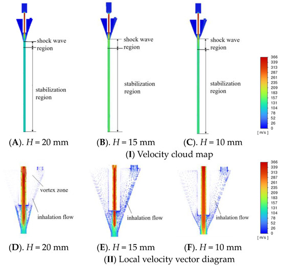 Based on the overall consideration, it can be concluded that the length of the mixing zone H of 15 mm is more appropriate. In this case, there is no localised vortex in the lower part of the inlet and the shock wave zone is small. At the same time, the negative pressure at the inlet (−365.953 Pa) and the steady-state gas flow rate (up to 135 m/s) are relatively high.