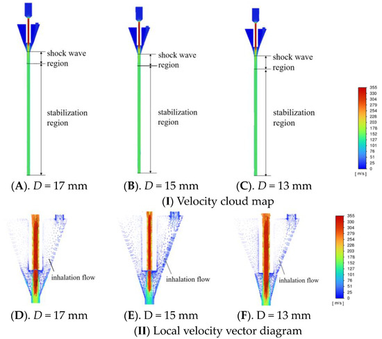 Based on the data shown in Figure 12, it can be seen that the extent of the shock wave zone does not vary much with different mixing zone inlet diameters, which suggests that their steady-state zones also do not differ significantly. When the mixing zone inlet diameter D is 13, 15, and 17 mm, respectively, there is no appearance of a vortex. However, when the mixing zone inlet diameter D is 15 mm, the inhalation flow of gas into the mixing zone is smoother. The effect of the diameter of the mixing zone inlet on the experimental index is shown in Figure 13.