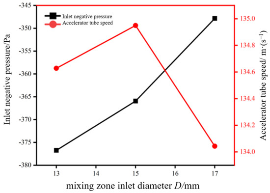 According to the results in Figure 13, the steady-state gas flow rate tends to increase and then decrease with the increase in the receiving chamber diameter. When the receiving chamber diameter D reaches 15 mm, the maximum value of the steady-state gas flow rate is 135 m/s. In addition, the negative inlet pressure also decreases with the increase in the inlet diameter of the mixing zone. When the inlet diameter D of the mixing zone is 13 mm, the maximum inlet negative pressure of 376.739 Pa is obtained.