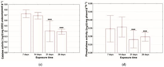 However, herbicide dose had no effect on Cat activity (F(4, 59) = 2.05, p = 0.384), despite an evident decrease observed at 21 days (Figure 2c). In contrast, exposure duration exerted a significant main effect on this enzymatic marker (F(3, 59) = 15.42, p < 0.001,η2 = 0.428). Post hoc testing disclosed significantly reduced values for Cat activity at 21 days compared to 7 days, but not at 14 days (Figure 3c). The measured levels at 28 days were comparable to those seen at the previous time point (Figure 3b). Overall, these results suggest that nicosulfuron may reduce soil Cat activity, but this effect occurs later compared to Deh activity and Ure activity.