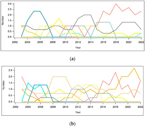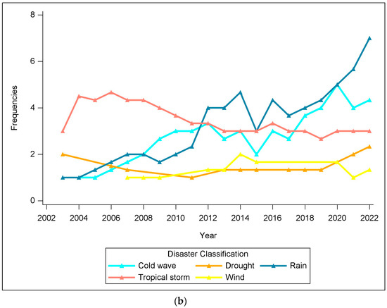 Three-year moving average of frequency of (a) all disasters and (b) various disasters from 2003 to 2022.