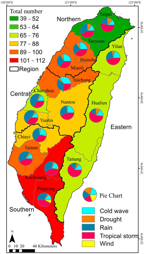 The present study segmented Taiwan into northern, central, southern, and eastern regions for analysis. These four regions exhibited variations in total disaster frequency by county (Figure 3). The lowest disaster frequencies were observed in the northern region, whereas the southern region experienced disasters most frequently. Tropical storms accounted for the majority of disasters in the eastern, northern, and southern regions. However, rain disasters accounted for an average of 31.46% of disasters across all regions. In some northern and relatively high-altitude areas of Taiwan, the proportion of cold wave disasters exceeded 20%. Because tropical storms typically develop in the eastern sea region, the eastern region experienced the highest proportion of tropical storms, which were the predominant disaster type in this region. By contrast, the central region experienced few tropical storms because of the barrier of Taiwan’s mountainous terrain.