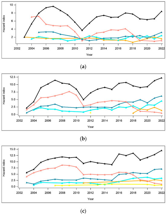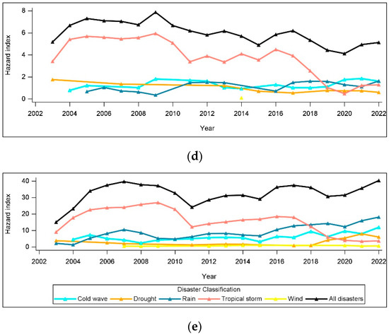 Three-year moving average for disaster hazard index values for 2003 to 2022 in the (a) northern region, (b) central region, (c) southern region, (d) eastern region, and (e) Taiwan as a whole.