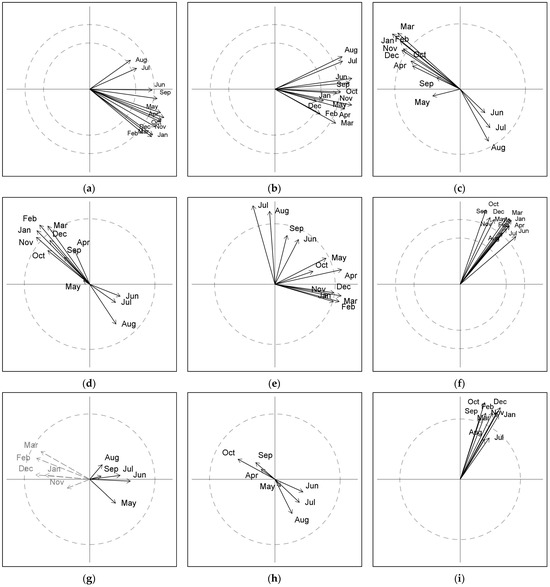 Loading plots for the first two components. The X and Y axes represent PC1 and PC2, respectively. The first (small) and second (large) circles indicate a magnitude of 0.5 and 0.7, respectively. (a) Mean daily maximum temperature, (b) mean daily minimum temperature, (c) total precipitation, (d) precipitation intensity, (e) number of dry days, (f) mean daily average wind speed, (g) number of extreme high (solid black line) and low (gray dashed line) temperature days, (h) number of days with heavy rain, and (i) number of days with strong wind.