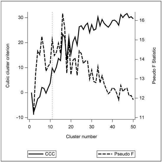 CCC and pseudo-F statistics under various potential cluster numbers. The dotted line represents the position of 11 clusters.