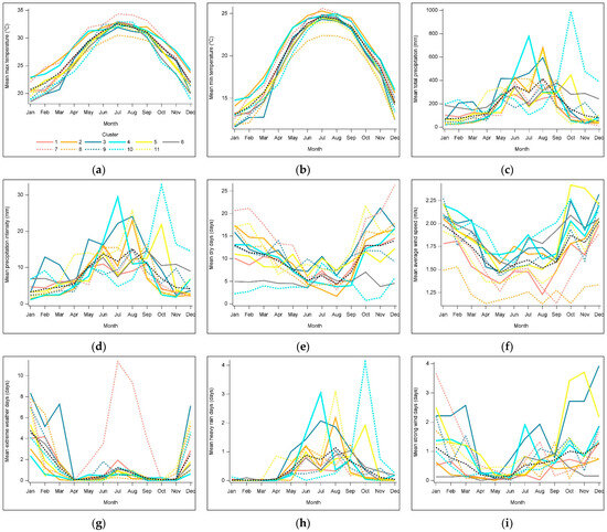 Monthly (a) mean daily maximum temperature, (b) mean daily minimum temperature, (c) total precipitation, (d) precipitation intensity, (e) number of dry days, (f) mean daily average wind speed, (g) number of extreme high and low temperature days, (h) number of days with heavy rain, and (i) number of days with strong wind for the 11 clusters. The black dashed line indicates the average of the weather variables for each month.
