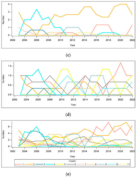 Three-year moving average for cluster frequencies from 2003 to 2022 in the (a) northern region, (b) central region, (c) southern region, (d) eastern region, and (e) all of Taiwan.