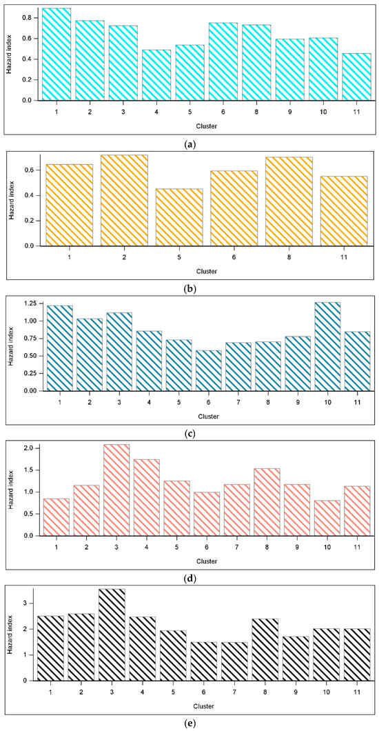 Variations in disaster hazards were observed between clusters (Figure 9e). Additionally, the results of an ANOVA revealed a significant effect of climate clusters on disaster hazards (Table S2). Cluster 3 exhibited the highest disaster hazard index values, whereas Clusters 1, 2, 4, and 8 exhibited moderate disaster hazard values. Cluster 1 exhibited the highest cold wave hazard values (Figure 9a), whereas Clusters 4 and 11 exhibited low cold wave hazard values. However, climate clusters did not significantly affect cold wave hazard values (p value = 0.0631). Only Clusters 1, 2, 5, 6, 8, and 11 experienced drought disaster hazards (Figure 9b), but no significant differences in drought disaster hazard values were observed between them. Additionally, the effects of climate on rain and tropical storm disaster hazards were significant. Clusters 1, 2, 3, and 10 exhibited high rain disaster hazard values (Figure 9c), whereas high tropical storm hazards were observed only in Clusters 3, 4, and 8 (Figure 9d).