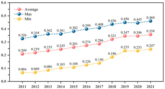 Agriculture and tourism integration index in China from 2011 to 2021. Note: the blue, red, and yellow lines indicate the maximum, average, and minimum values of ATI, respectively.