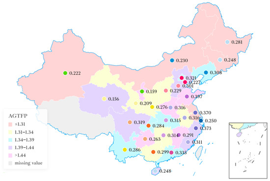 The spatial distribution of AGTFP reveals significant differences among Chinese provinces. It is worth noting that provinces like Shandong, Henan, Guizhou, Ningxia, and Jiangxi exhibit higher AGTFP levels (AGTFP 1.44), which suggests that they have superior agricultural efficiency and environmental performance. These provinces generally have favorable natural conditions, such as a suitable climate, fertile soil, and abundant water resources, which contribute to efficient agricultural production. Additionally, these provinces have implemented advanced agricultural technologies and promoted environmentally friendly farming practices, thereby increasing their agricultural productivity and sustainability.