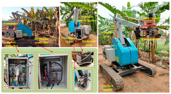 The banana-picking robot described in this study is shown in Figure 1. The main structure consists of a tracked vehicle walking mechanism, the robot arm body, and the end-effector. The tracked vehicle measures 1.963 m in length, 1.490 m in width, and 4.24 m in height. The large-size design ensures its stability, adaptability, and load-bearing capacity while navigating the banana plantation. It is driven by an AC servo motor that operates a hydraulic oil pump, supplying pressure oil from the hydraulic oil tank to the hydraulic motors on both sides of the tracked vehicle through an electromagnetic directional valve. This design endows the tracked vehicle with powerful propulsion and agile steering capabilities. The hydraulic oil tank has a storage capacity of approximately 30 L, providing ample hydraulic oil to meet long working hours. The design of the hydraulic system ensures efficient power transmission and stable operating performance for the tracked vehicle. The robot arm body is controlled by a robot controller, which includes servo motor drivers for each joint and a Socket communication module. The end-effector is also driven by a hydraulic system, with the hydraulic control adjusting the pressure within the range of 0 to 15 MPa and a dynamic pressure of 3 MPa. The power source is a portable power device with a power output of 10 kW and a capacity of 15 kW·h. The robot uses an Intel Realsense D435i depth camera to capture color and depth images of the banana stalk, utilizing active infrared light to perceive target distance, with a minimum sensing depth of 0.1 m and a field of view of 91.2° (horizontal) × 65.5° (vertical). The computer comes with a 13th-generation Intel Core (TM) i7-13650hx@2.60GHz processor, 16 GB of RAM, and a GeForce RTX 4090 with a 16 GB graphics card.