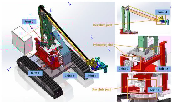 Three degrees of freedom can reach the position of the banana stalk in the workspace, but due to the limited posture of three degrees of freedom, the wrist joint’s posture cannot be adjusted. Therefore, adding one degree of freedom allows the wrist joint to rotate on the z-axis, adjusting the end-effector’s spatial position according to the banana’s posture. The designed robot body model is shown in Figure 2. The robotic arm consists of four joints: Joints 1 and 4 are rotary joints, while Joints 2 and 3 are coupled translational joints. Joint 1 allows the arm to rotate in the horizontal plane, expanding its working range and enabling it to target from different directions. Joint 2 adjusts the arm’s length through horizontal translation, allowing it to extend or retract to operate at varying distances. This function ensures the end-effector can accurately grasp and cut banana stems. Joint 3 adjusts the arm’s height via vertical translation, adapting to different stem heights. Joint 4, another rotary joint at the arm’s end, precisely controls the end-effector’s orientation.