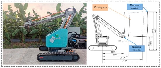 In banana plantations with wide–narrow row planting, the wide row spacing is 3.8 m, and the narrow row spacing is 1.2 m. The height of the banana stalk is generally between 2.6 m and 3.1 m. Therefore, the operational range of the robot should be adapted to the actual working environment. As shown in Figure 3, the prototype of the robot and its corresponding operational space are depicted. Based on the center of the robot chassis, the minimum height and length in extreme conditions are 1.033 m and 1.495 m, respectively. The maximum picking height reaches 2.972 m, and the maximum length is 3.129 m. With the movement of the second and third joints, the robot can operate within the extreme boundary area, forming an approximately matrix-shaped working range due to the coupling of the joints. The center of the end-effector’s gripper is 0.103 m from the reference point at the fourth axis’ screw center.