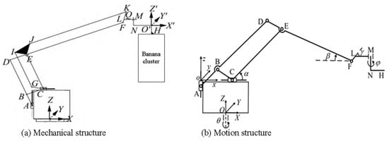 End-effectors are one of the core components of a harvesting robot, and most end-effectors need to be designed according to the characteristics of the fruit to be harvested. Liu et al. [16] designed a six-finger flexible robotic hand to achieve flexible grasping of agricultural products, introducing a smooth grasping control strategy to ensure apple picking with the most appropriate force levels. Li et al. [17] addressed the low efficiency of citrus harvesting by designing a wrap-around swallowing harvesting mechanism, verifying its feasibility for citrus harvesting. Li et al. [18] designed a rope-driven adaptive, non-destructive harvesting end-effector based on a human hand to achieve 100% successful harvesting of pears without damage. Xie et al. [19] optimized the key structural parameters of a cherry tomato harvesting end-effector based on the Box-Behnken design technique, achieving a 76% success rate for harvesting fruits of different diameters. Cai et al. [20] proposed a pneumatic soft gripper that bends and extends by driving a silicone body, verifying its grasping performance for strawberries. These end-effectors have achieved good results for different fruits, but these fruits are relatively small and light. The main features of a banana harvesting end-effector include grasping and cutting, and it needs to be able to bear a significant weight. Designing an end-effector that meets these requirements is a potentially effective solution for autonomous banana harvesting.