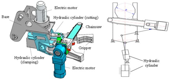 To achieve integrated clamping and cutting of the banana stalk, the end-effector is designed as a composite mechanism that combines clamping and cutting functions. The design of the end-effector needs to ensure stability during cutting, enabling the separation of the banana bunch from the tree while preventing the bunch from falling off the end-effector. Additionally, since the diameter of the banana stalk ranges from 60 to 120 mm, the opening size of the clamping device should meet this condition.