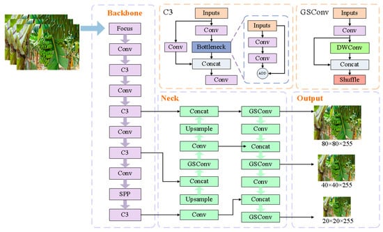 To ensure high-precision detection of banana stalks while meeting real-time detection requirements, this study improved the detection network design based on YOLOv5s, as shown in Figure 6. The improved YOLOv5s model is similar to YOLOv5 [33] but introduces a new lightweight Group Shuffle Convolution module (GSConv) [34] in the neck layer. The specific operations of this model are as follows: