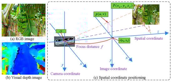 In this study, the RealSense D435i camera, which is based on structured light projection technology, was used to capture color and depth images of the banana stalks. Based on the depth information and spatial coordinate transformation, the spatial coordinates of the banana stalks were obtained, as shown in Figure 7. The spatial coordinate transformation is given by Equation (5).