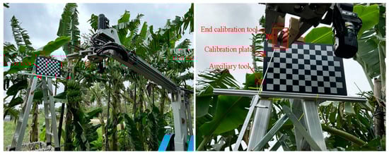 During the actual harvesting process by the robot, the spatial coordinates of the stalk need to be transformed into the robot coordinate system. After calibrating the camera’s internal parameters, the hand-eye calibration method was used to complete the calibration between the camera coordinate system and the robot coordinate system [36,37]. To improve calibration accuracy, an additional tool coordinate system was added to the end-effector to obtain more precise calibration data, as shown in Figure 8. By calibrating the camera’s internal and external parameters, the spatial coordinates of the stalk in the camera coordinate system can be converted to the robot coordinate system, enabling the robot to accurately harvest the banana stalks.