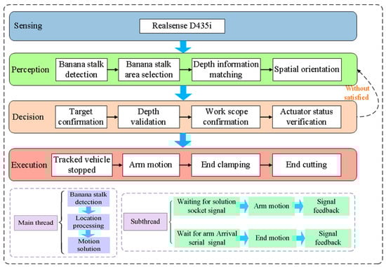 To achieve autonomous harvesting operations with the banana-harvesting robot, various functional modules must be highly integrated. These mainly include the perception system, decision logic, operation execution, and communication system. The main design of the control system is shown in Figure 9.