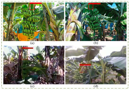 Banana stalk detection results in different scenarios. (a) in Suixi county, Zhanjiang city. (b) in Zengcheng, Guangzhou city. (c) in Zhongkai College of Agricultural Engineering. (d) in Guangdong Academy of Agricultural Sciences.