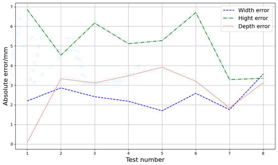 Statistical analysis indicated that the absolute error in the height direction was relatively large, with a maximum error of 6.854 mm. The average absolute positioning errors in the height, width, and depth directions were 5.159 mm, 2.405 mm, and 2.760 mm, respectively. The robot’s positioning accuracy for the target location was high, meeting the requirements for harvesting banana stalks.