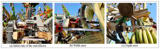 As shown in Figure 13a, this is the initial state of the end-effector during the actual harvesting process, with a jaw size of approximately 26 cm. The harvesting process involves visual detection and positioning, then converting the camera coordinate system to the robot coordinate system using hand–eye calibration parameters, and finally reaching the harvesting point through robotic kinematic calculations. Due to the large length of the banana stalk in the height direction, which can all be considered as potential harvesting points, height errors were not measured. As shown in Figure 13b,c, the width and depth errors during the actual harvesting process were measured. The errors in the corresponding directions between the stalk center and the end-effector did not exceed 5 cm, which is entirely sufficient for the end-effector with its larger size to meet the harvesting requirements.