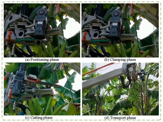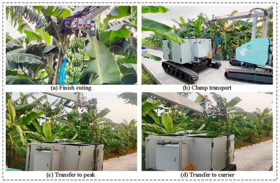 Figure 17 depicts the handling process after banana harvesting. After autonomously gripping and cutting the banana bunches, they were maintained in the gripped state and transported along a pre-set path. This process was consistently executed at a higher elevation, as shown in Figure 17c. As the banana bunches reached the highest point of the transport vehicle’s receiving opening, they gradually descended to transfer the bunches onto the transport vehicle. While the preset procedure successfully harvests and transports the banana bunches, most path points were predetermined. In future research, efforts will focus on achieving dual-machine collaborative autonomous operations between harvesting and transport equipment.