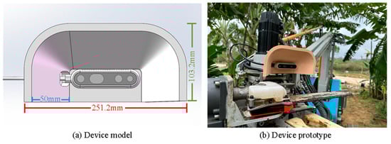 First, a sunshade was designed for the depth camera on the robot body, as shown in Figure 15. The sunshade device measures 251.2 mm in length, 50 mm in width, and 103.2 mm in height, with a top angle of 51.12°. This design prevents direct sunlight exposure while maintaining an unobstructed field of view.