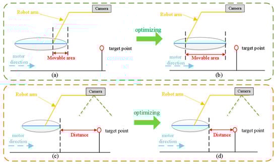 Picking area optimization. (a,b) are movable area optimization comparison. (c,d) are target distance optimization comparison.