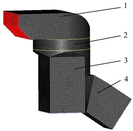 Simulation model of the extractor. 1—Outlet zone. 2—Fan blade zone. 3—Material separation zone. 4—Material throwing area.