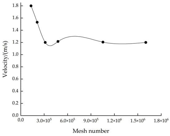 Based on this, multiple models with different mesh sizes were established for independence verification. Under the premise of meeting the mesh quality requirements, for the simulation tests with different mesh quantities, the fan speed was set at 600 rev/min, and the average velocities of the airflow at the outlet surface were obtained, respectively, and compared. With an increase in the number of meshes, the flow velocity at the outlet tends to stabilize. When the number of meshes reaches approximately 313,893, the velocity basically remains unchanged, and the computing error at this time also tends to stabilize (see Figure 4). Considering the computing error and efficiency comprehensively, this model was selected for subsequent calculations.