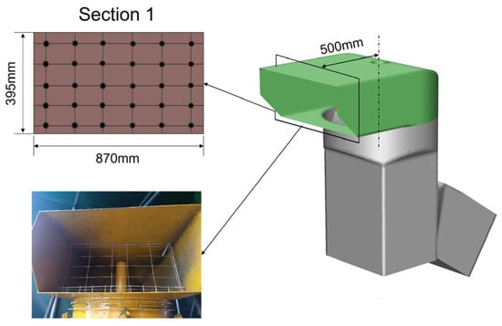 To validate the accuracy of the airflow field simulation model, the simulated flow values at the extractor outlet were compared with test data. Following the flow measurement protocol outlined in the “Industrial Ventilation Fan On-Site Performance Test” [29], a cross-section was chosen at the extractor outlet, and measurement points in the rectangular duct were distributed using the Chebyshev method (refer to Figure 5). Wind speeds at various rotational speeds (600, 700, 800, 900, 1000, 1100) were recorded and averaged to determine the flow values. The test was repeated three times, and the average value was taken. The measurement tool was a SMARTT SENSOR split-type anemometer (The accuracy of wind speed was ±3%).