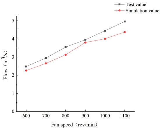 Using ANSYS Fluent 19.2 software, a steady simulation was conducted on the airflow field of the extractor to determine simulated wind speeds and calculate the flow. The flow results from test and simulations at various speeds are illustrated in Figure 6. The trend of the simulated flow values aligns consistently with the test values, showing an increase in flow as the fan speed rises. The maximum relative error is 11.7%, the minimum is 3.9%, and the average is 9%. In conclusion, the simulation model for the airflow field of the extractor is reasonably reliable, the numerical simulation method is accurate, and it is suitable for investigating the internal flow dynamics of the extractor.