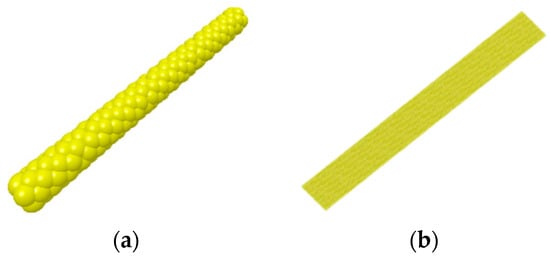 Based on the results of the physical measurements, geometric models of billets and leaves were created using Solidworks2016 software and then imported into EDEM 2020 in stl format. The modeling of billets and leaves involved a multi-sphere aggregation model and the XML method, incorporating the Hertz–Mindlin non-slip contact model between particles. The simulation models of billets and leaves were filled using the automatic filling model, and the central coordinates of all particles were exported to a .csv file, which was subsequently processed to generate a .xml file. Upon setting up a new particle project in EDEM and importing the .xml file, the software automatically generated a discrete element simulation model. The filled model was exported as a .dec file, serving as a particle template for future simulation runs. The discrete element models of billets and leaves are illustrated in Figure 7.